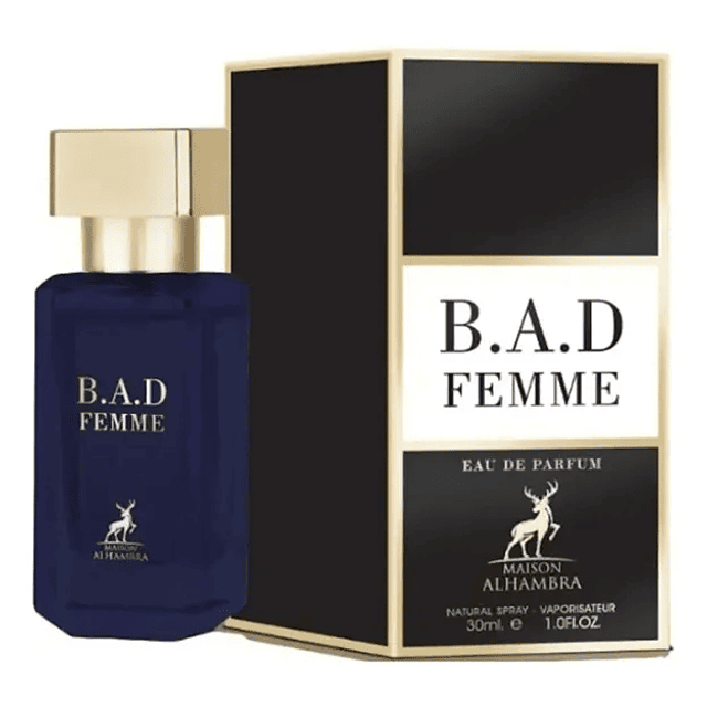 B.A.D. Femme de Maison Alhambra es una fragancia de la familia olfativa Floral Frutal Gourmand para Mujeres. B.A.D. Femme se lanzó en 2022. Las Notas de Salida son bergamota, almendra, café y limón (lima ácida); las Notas de Corazón son nardos, rosa de Bulgaria (rosa Damascena de Bulgaria), flor de azahar del naranjo, jazmín sambac (sampaguita) y raíz de lirio; las Notas de Fondo son haba tonka, vainilla, cacao, almizcle, madera de cachemira, sándalo, praliné, cedro, ámbar, pachulí y canela.
